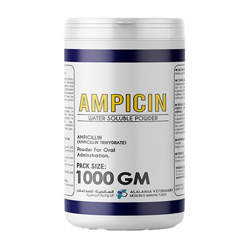 الأمبيسيلين مستقر في الوسط الحمضي ويتم امتصاصه جيدًا من الجهاز الهضمي، لذلك يمكن إعطاؤه في ماء الشرب لاستخدامه في السيطرة على الالتهابات الجهازية.
